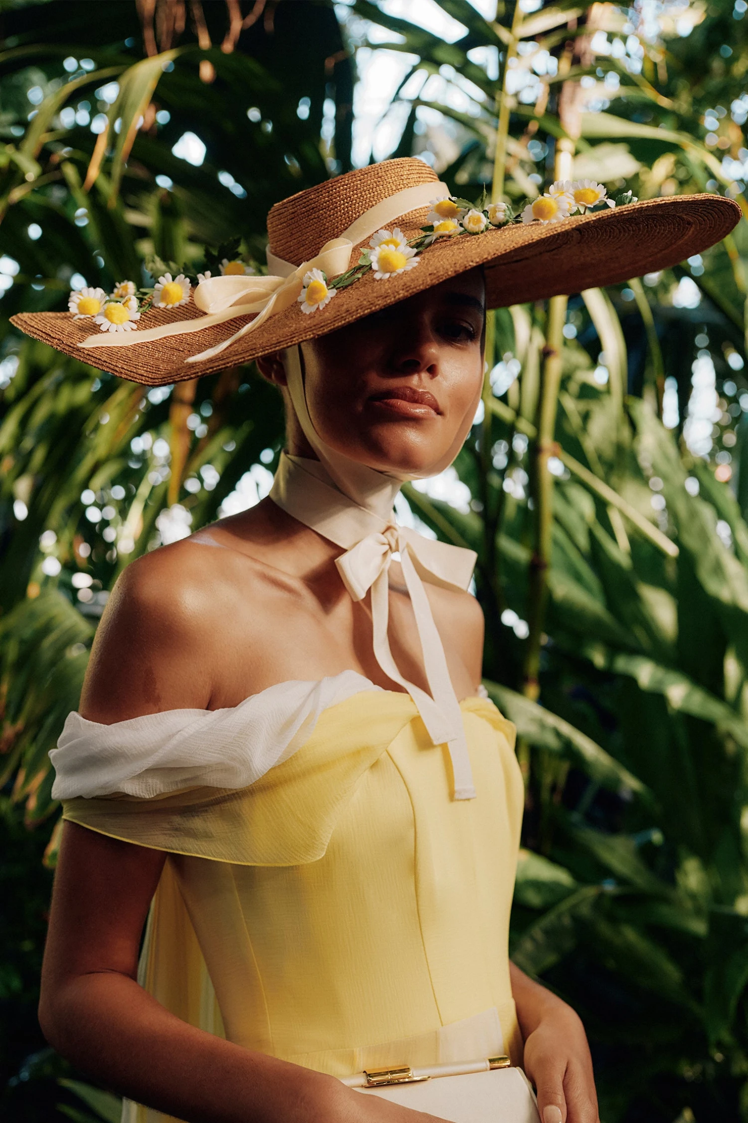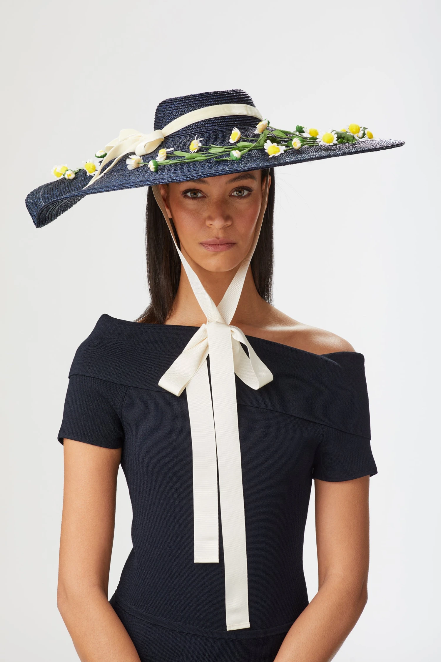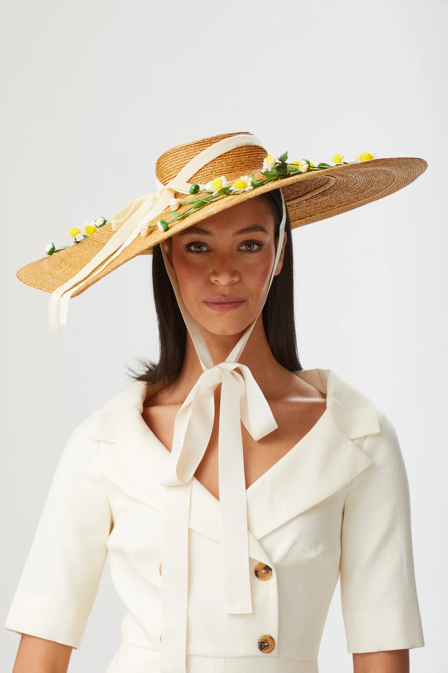 The Kalahari is a wide-brimmed pedal straw boater with galloon ribbon chin ties, velvet ribbon bow, and vintage daisy detailing.