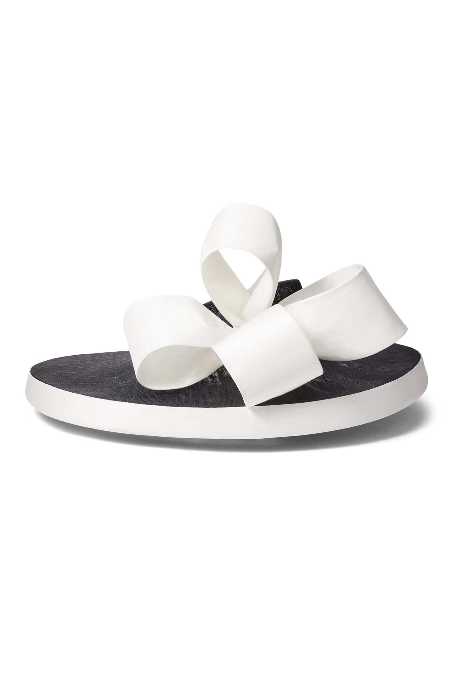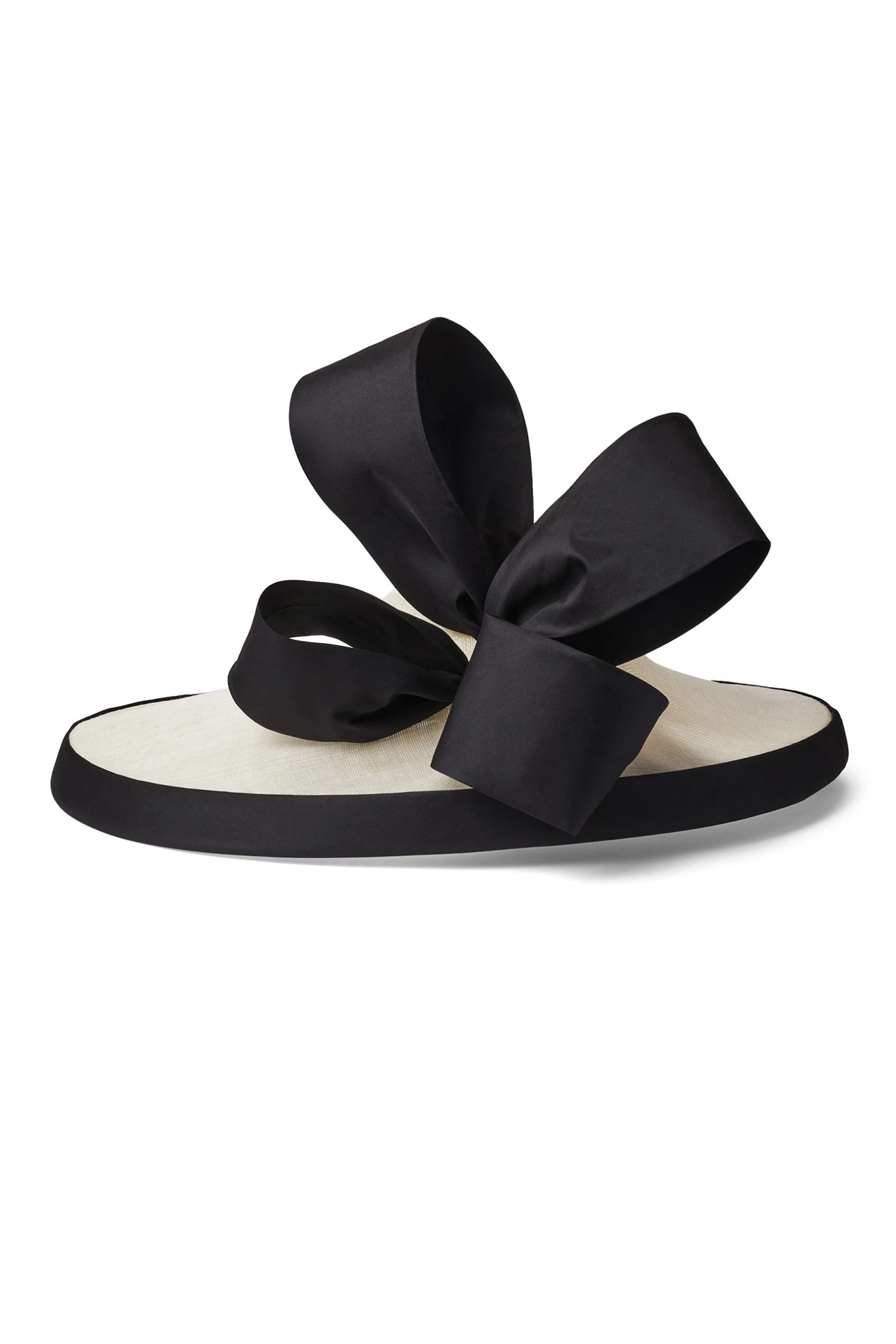 Mirage is crafted with an asymmetric crown and an elaborate silk bow with a silk taffeta brim-edge trim.Â