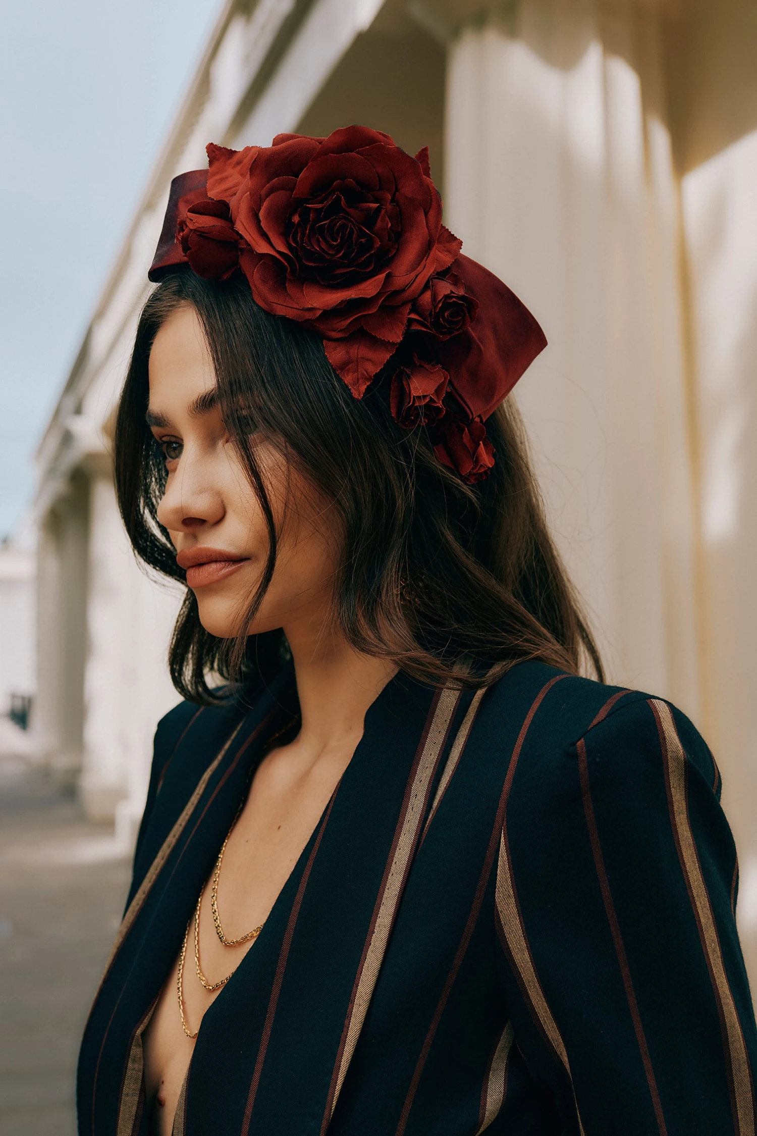 The Phillimore headband is romance embodied. Luxurious silk dupion folds create the backdrop for a blossoming silk rose, all positioned on a silk covered headband.