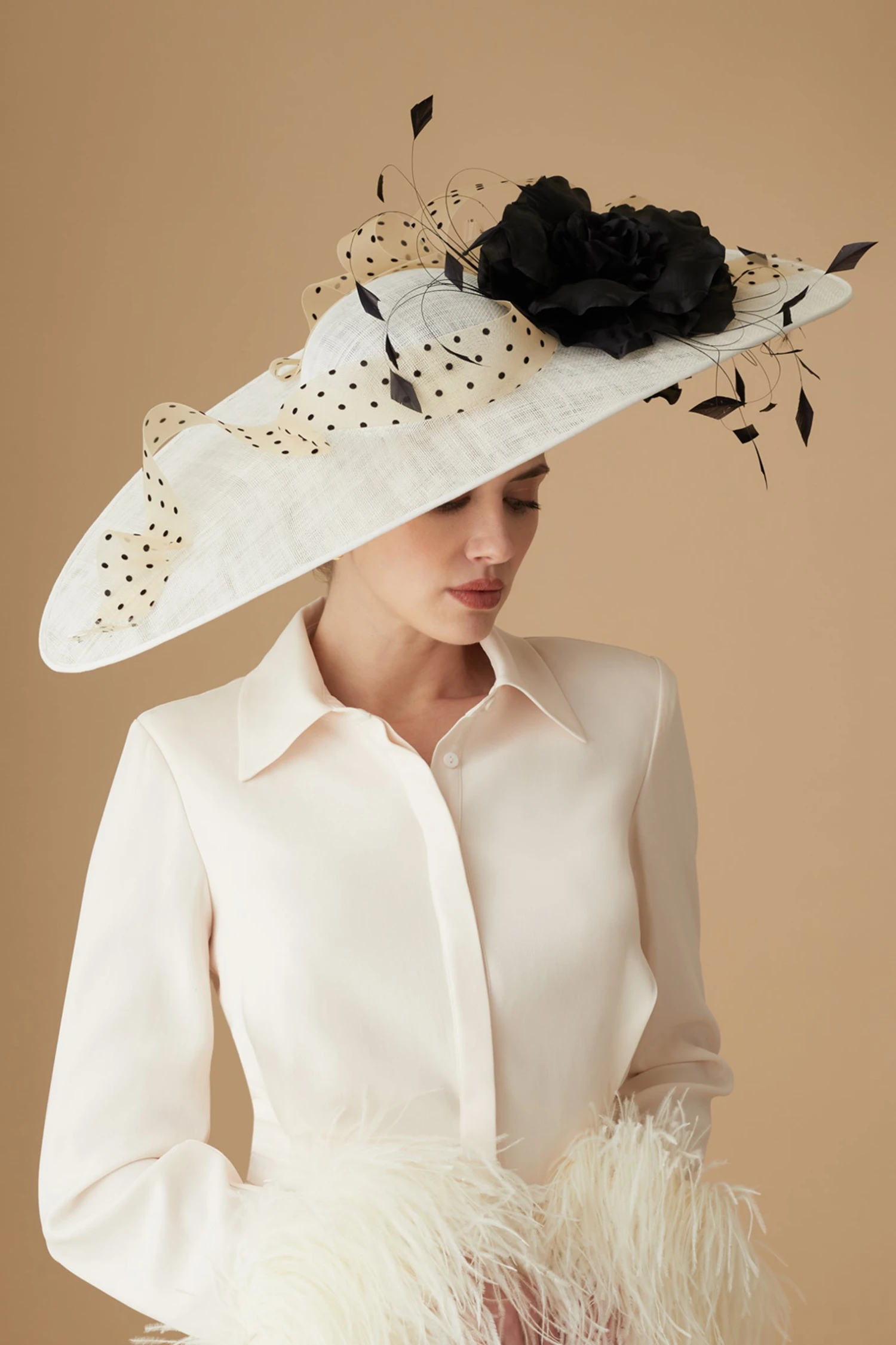 “Add drama to your day at the races with this wide-brim showstopper.” Awon Golding, Head Millinery Designer.